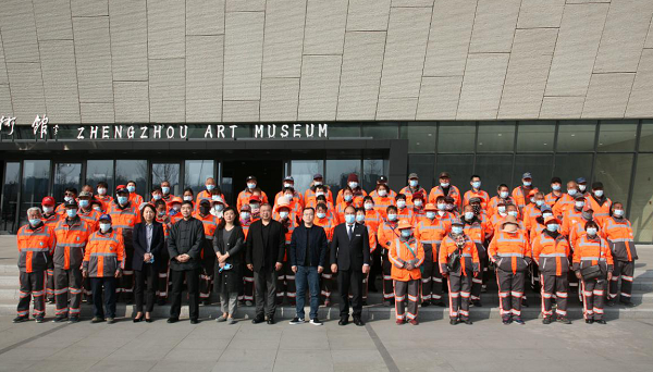 2月23日下午,郑州美术馆迎来了城市的“美容师”——70位中原环卫工人、城市安全的守护者——120位中原消防官兵走进美术馆观展,在美术馆前合影留念。